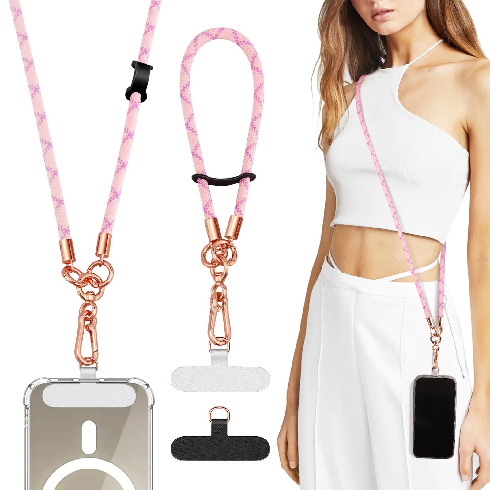 ["【Perfect Cellphone Mate】No pockets on your outfits? Cant free your hands to reach your cell phone? Then you may need this TiMOVO cell phone lanyard which allows you to conveniently hang your cell phone around your neck or wrist. Whenever you take photos go shopping or walk your dog you can easily reach and use your phone and also reduce the risk of losing phone." 【Premium & Adjustable】The neck lanyard and wrist strap are made from wear-resistant sturdy polyester to ensure durability and the strong metal clasp and secure tether avoid accidental falling off. The phone lanyard crossbody can be easily adjusted to fit over your shoulder or across your body let you pleasantly carry your phone. 【Detachable Connector Accessories】The connector ring and hook on the phone strap can be detached freely. You flexibly use the lanyard as a fashion necklace or crossbody bag strap take it as a connector for small objects such as keys. Whether you are shopping traveling walking the dog biking or taking pictures this cell phone lanyard keeps your hands free. "【Easy to Use】No tools needed just pass the tether patch through the charging hole of the phone case and then connect the clasp to the phone strap crossbody. The thin patch supports both wired and wireless charging without removing it and it wont block the charging port. (Note: Only works on full-edge phone cases)" "【What You Will Get】You will get 1 x crossbody phone lanyard (total length: 120cm) 1 x phone wrist strap (total length: 36cm) 2 x lanyard patches. If you have any question about the product please let use know were always here to help you."]
